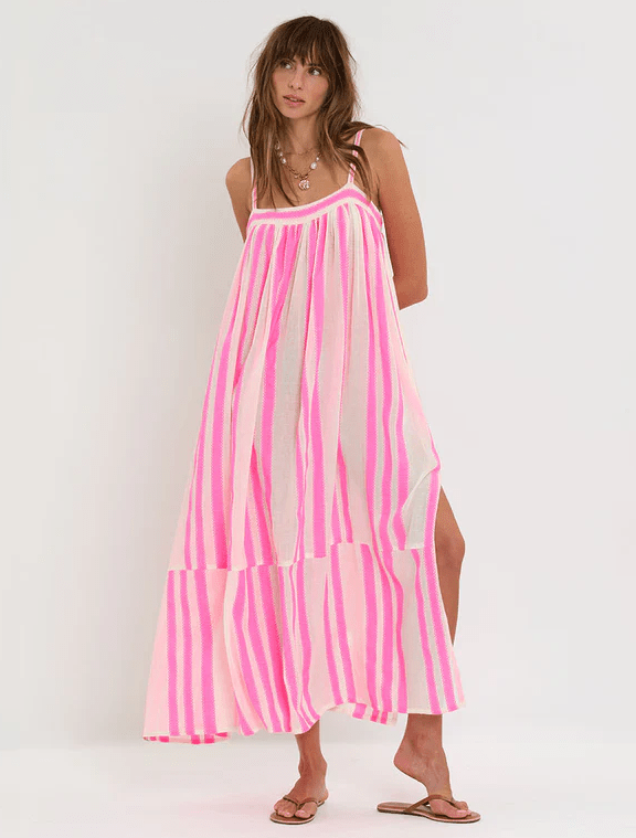 This maxi dress boasts a flattering neckline and a flowing, relaxed silhouette. It is versatile enough to wear as a cover-up or a stylish summer dress.