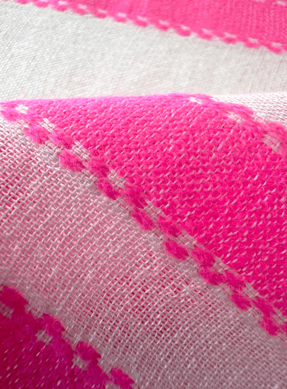 The Zefeni Fuchsia collection features a ribbon stripe pattern with a picot edge in vibrant neon pink on a soft vanilla background.