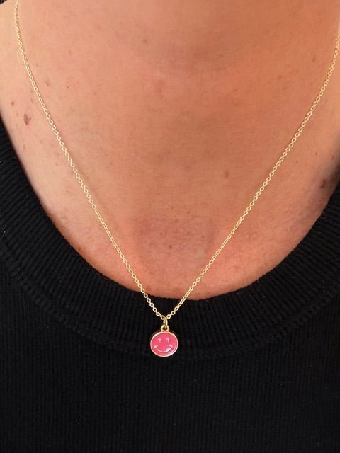 A rosy pink smiley face pendant dangles from a warm gold plated chain, bringing that perfect pop of color and personality to any look. Retro-inspired, trend-forward, and guaranteed to make people smile right back at you.