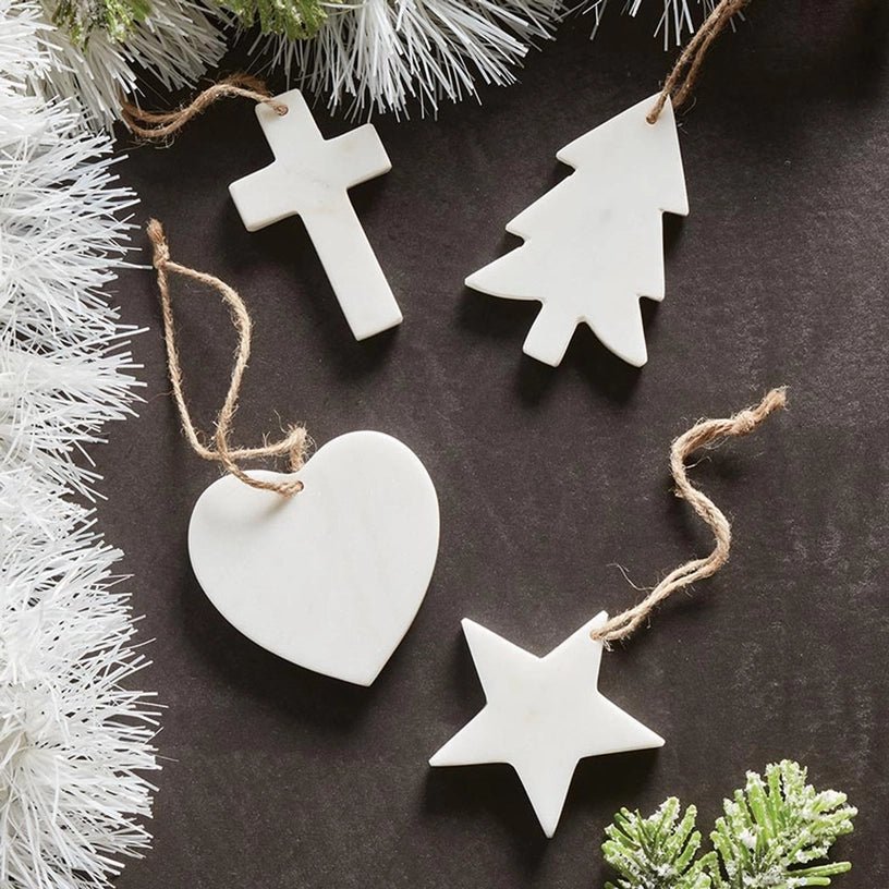 Add a touch of sophistication to your home. Handcrafted from premium marble, each piece is a unique masterpiece, showcasing its own distinctive veining and natural beauty. Complete your collection with all 4 unique marble ornaments. 3.25" L x 3.25" W x .25" H