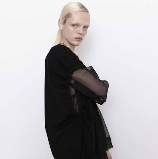 Short sleeve crew neck tee with organza sleeves.  Layered look, without the disjointed effect.