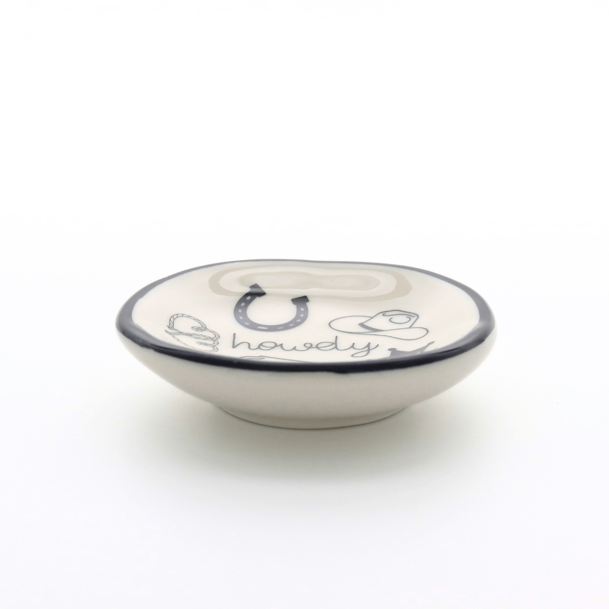 Saddle up your jewelry and greet the day in style. A ceramic ring dish stamped with “Howdy”. Perfect for keeping rings, earrings, or small keepsakes organized with a touch of rustic charm. Product Dimensions: 3" diameter x .75" height In-box: 3.5" x 3.25" x 1.5"