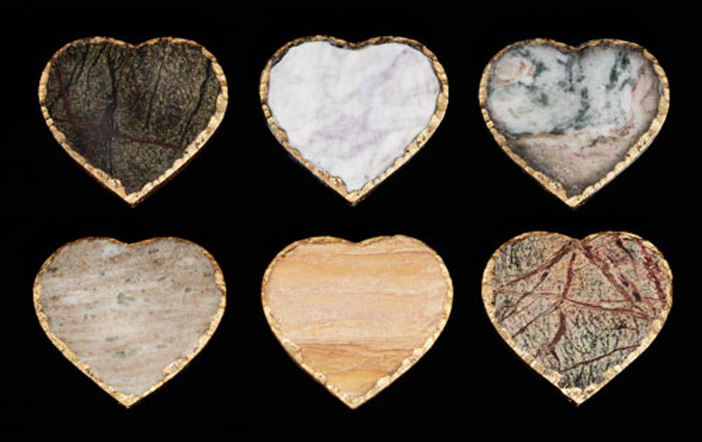 TLC for your table! A beautiful set of six natural marble coasters makes a rock-solid gift for the hostess-with-the-mostest! Each heart-shaped coaster is a different natural color. All edges are gold. Cork bottoms protect tables from drips and rings.