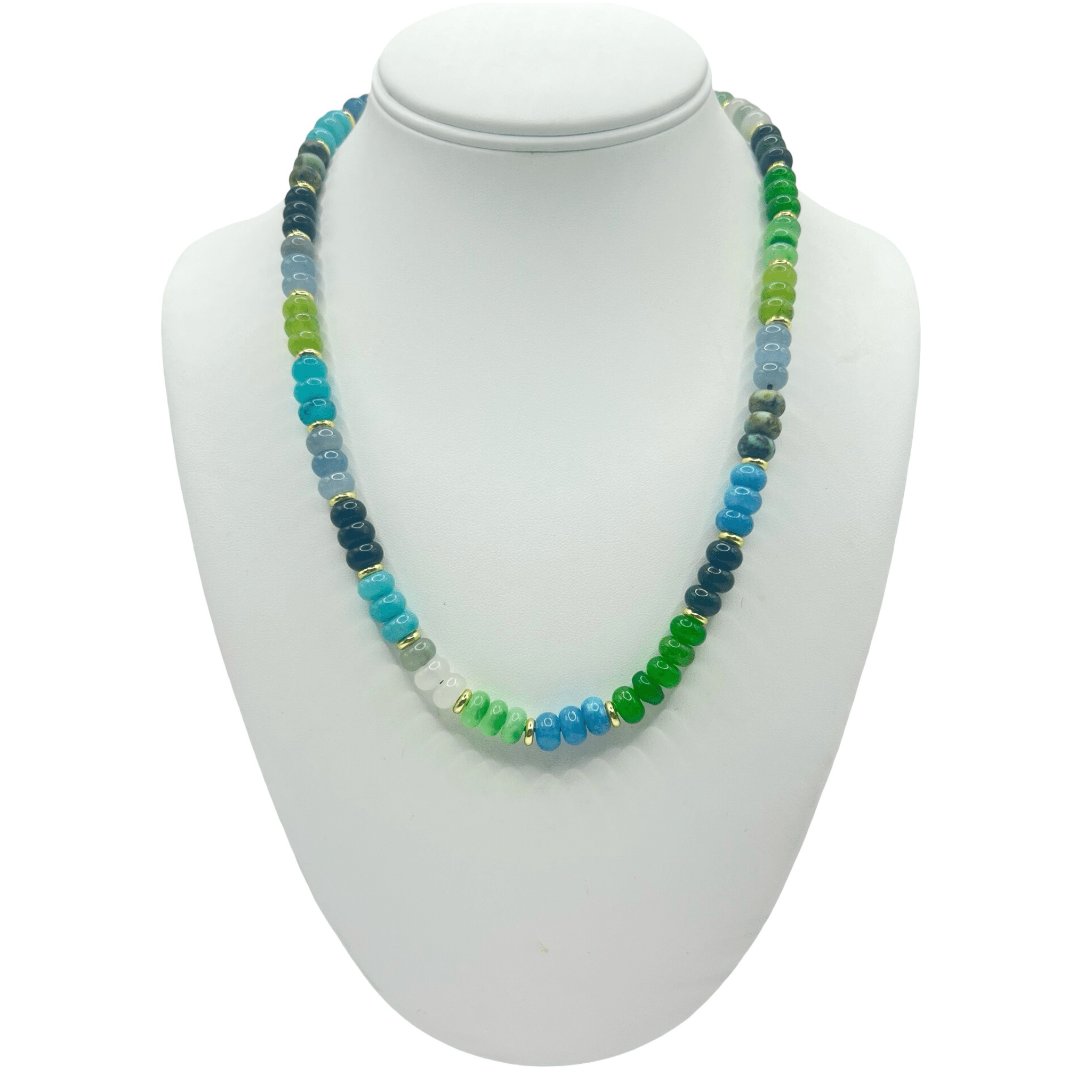 This vibrant beaded necklace features a stunning blend of rich blues, lush greens, and soft neutrals, reminiscent of a tropical rainforest. Accented with subtle gold spacers, the smooth, rounded beads create a fresh and elegant look. * Measures 18" in length * Crafted with 18k gold-filled hardware & semi precious beads * Handmade in our Charleston, South Carolina studio. * To keep your HOLST+LEE piece shining, avoid prolonged exposure to water, lotions, and sprays.