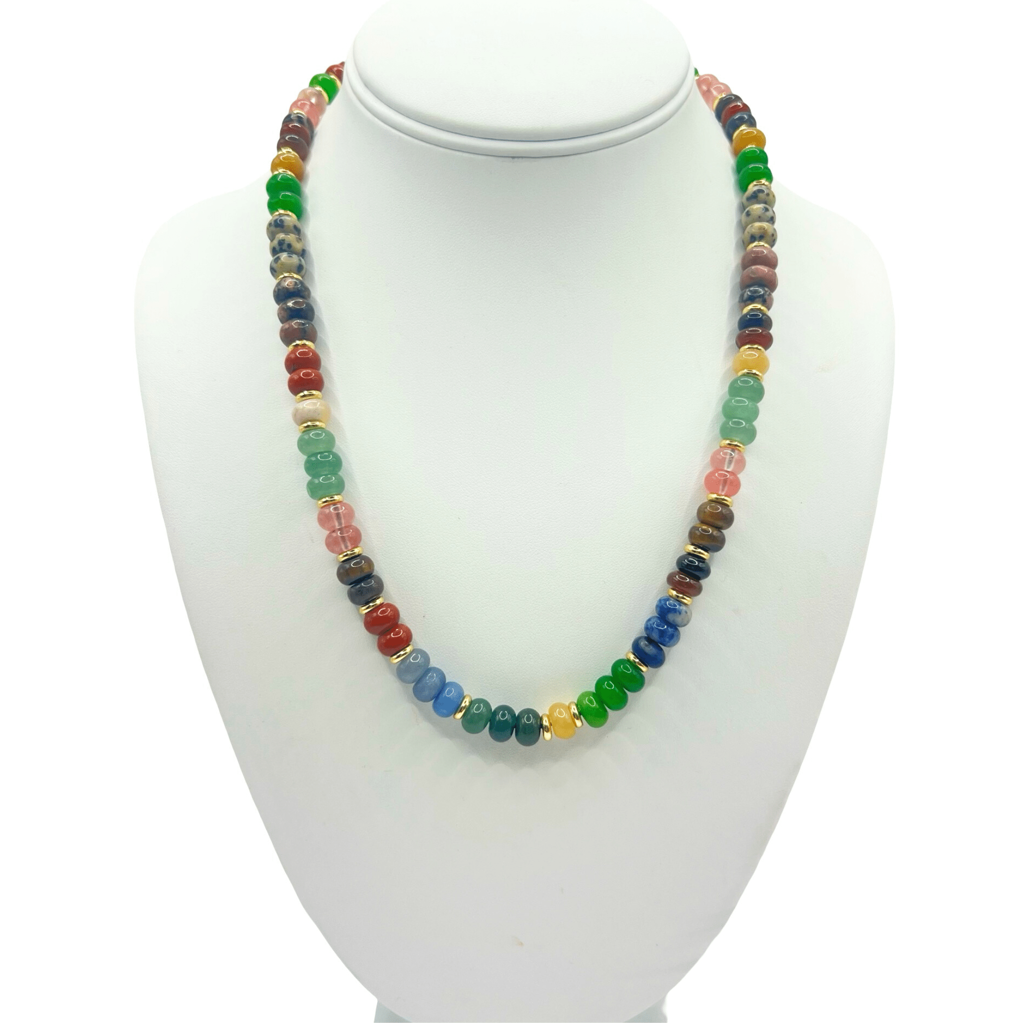 A vibrant celebration of color and texture, the Riverstone Necklace features an eclectic mix of multi-colored beads, each separated by gleaming gold spacers. From deep blues and forest greens to soft pinks and earthy tones, this necklace evokes the natural beauty of river-polished stones.
