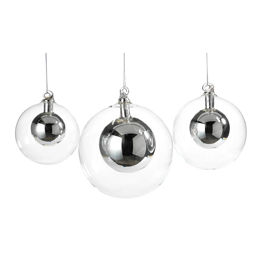 Large clear glass ball ornament with a smaller silver ball inside.