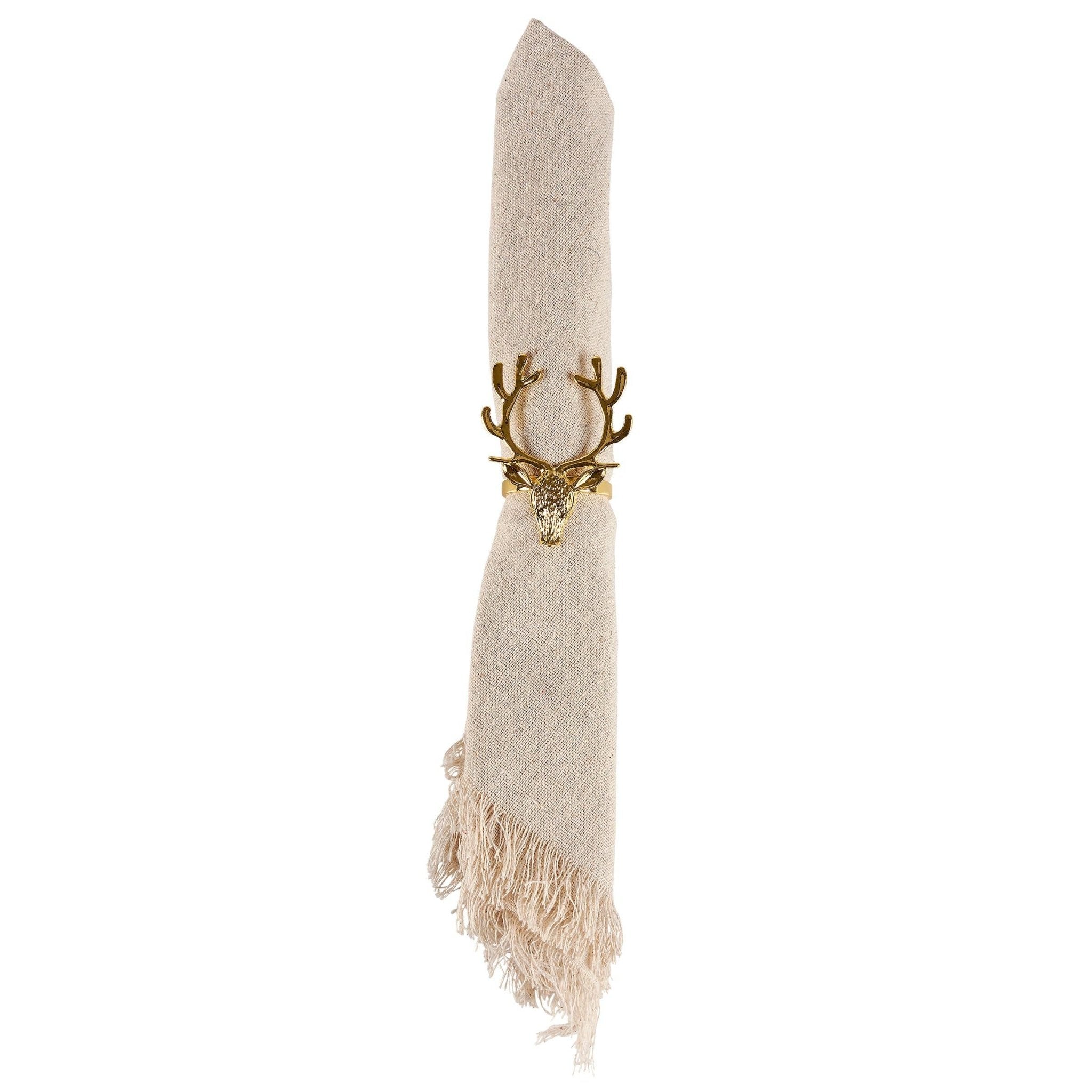 A metal napkin ring from our Christmas Collection featuring a gold deer head and antlers. Our Golden Deer napkin ring includes attached gold ring that easily slips over rolled napkin and can be added to table setting when not in use as a seasonal accent. Napkin pictured not included. A rustic tabletop accessory perfect for seasonal gatherings.