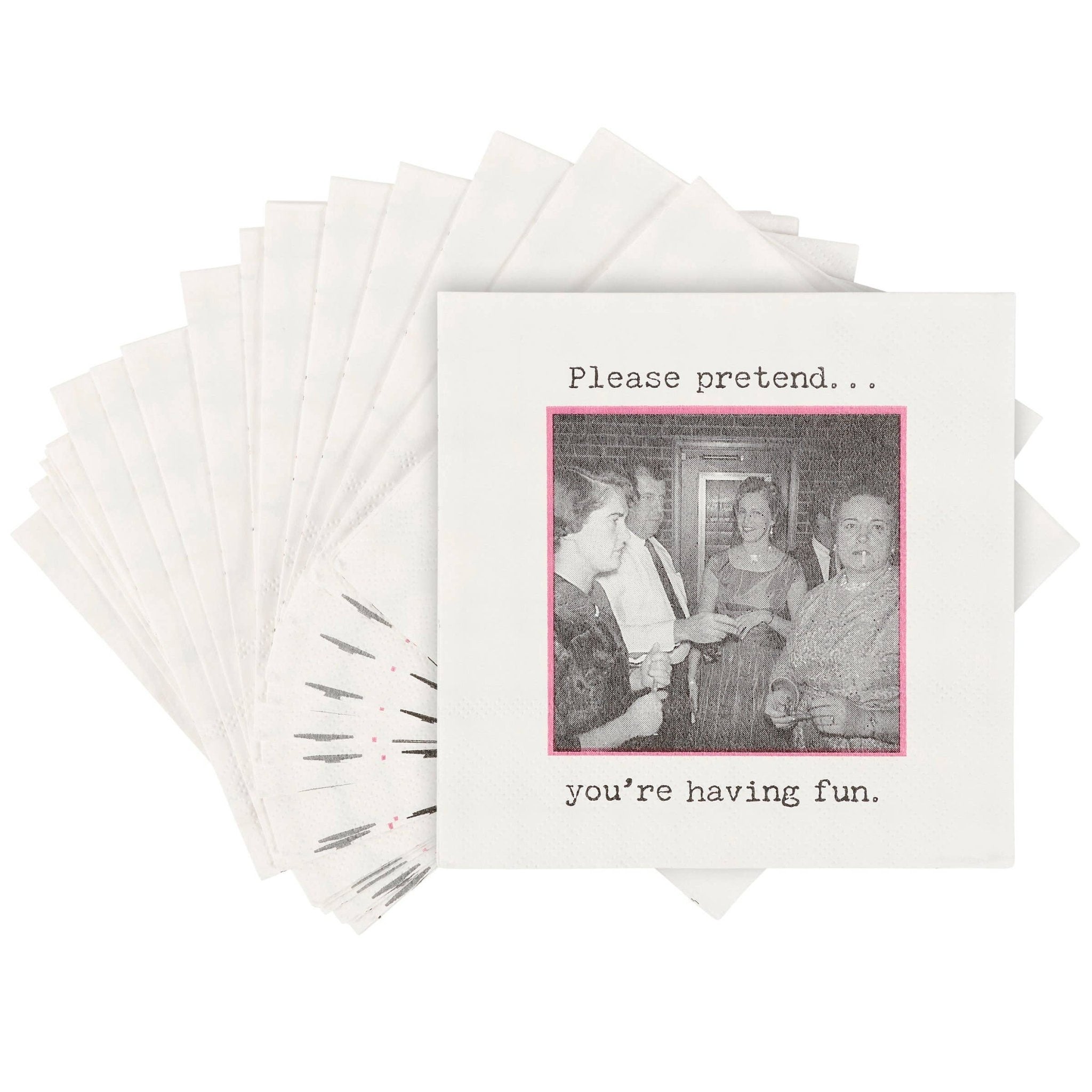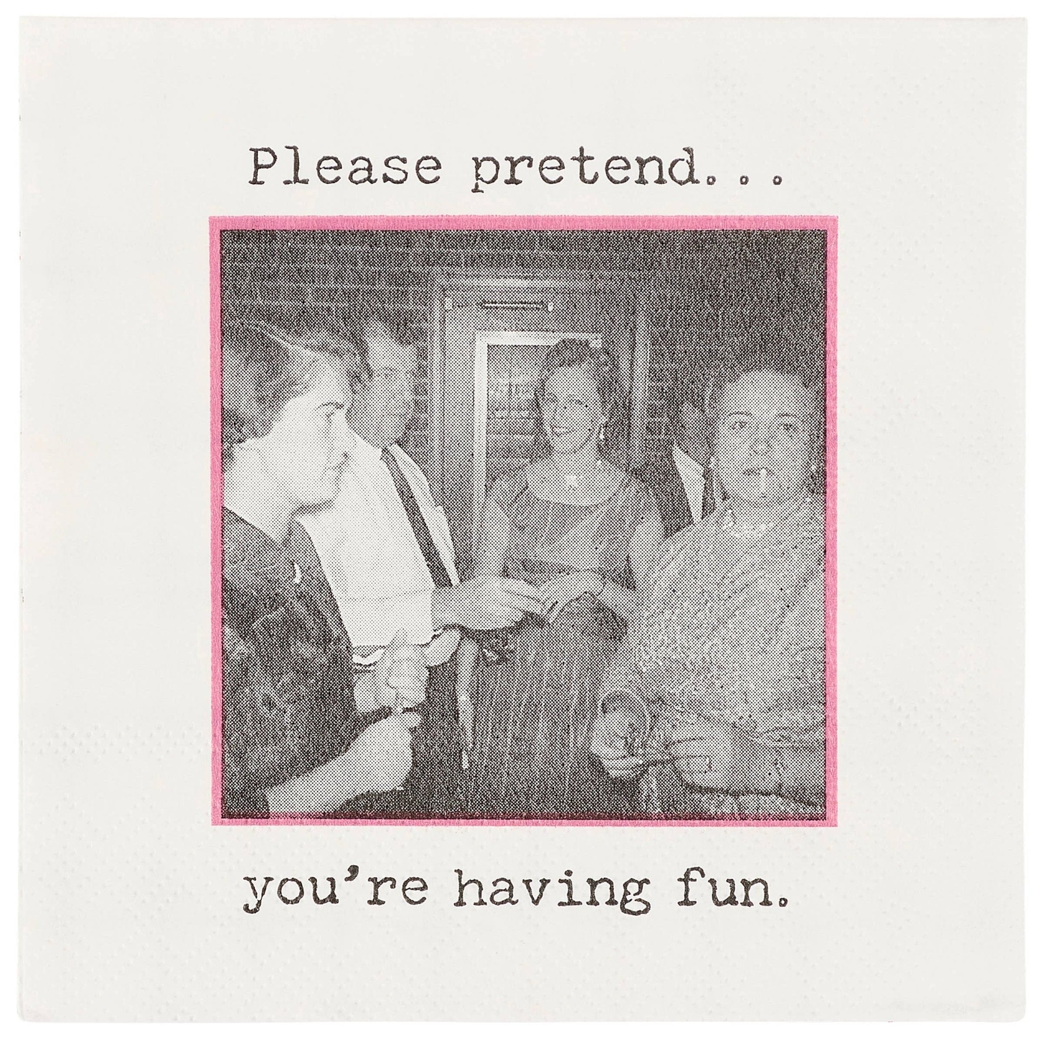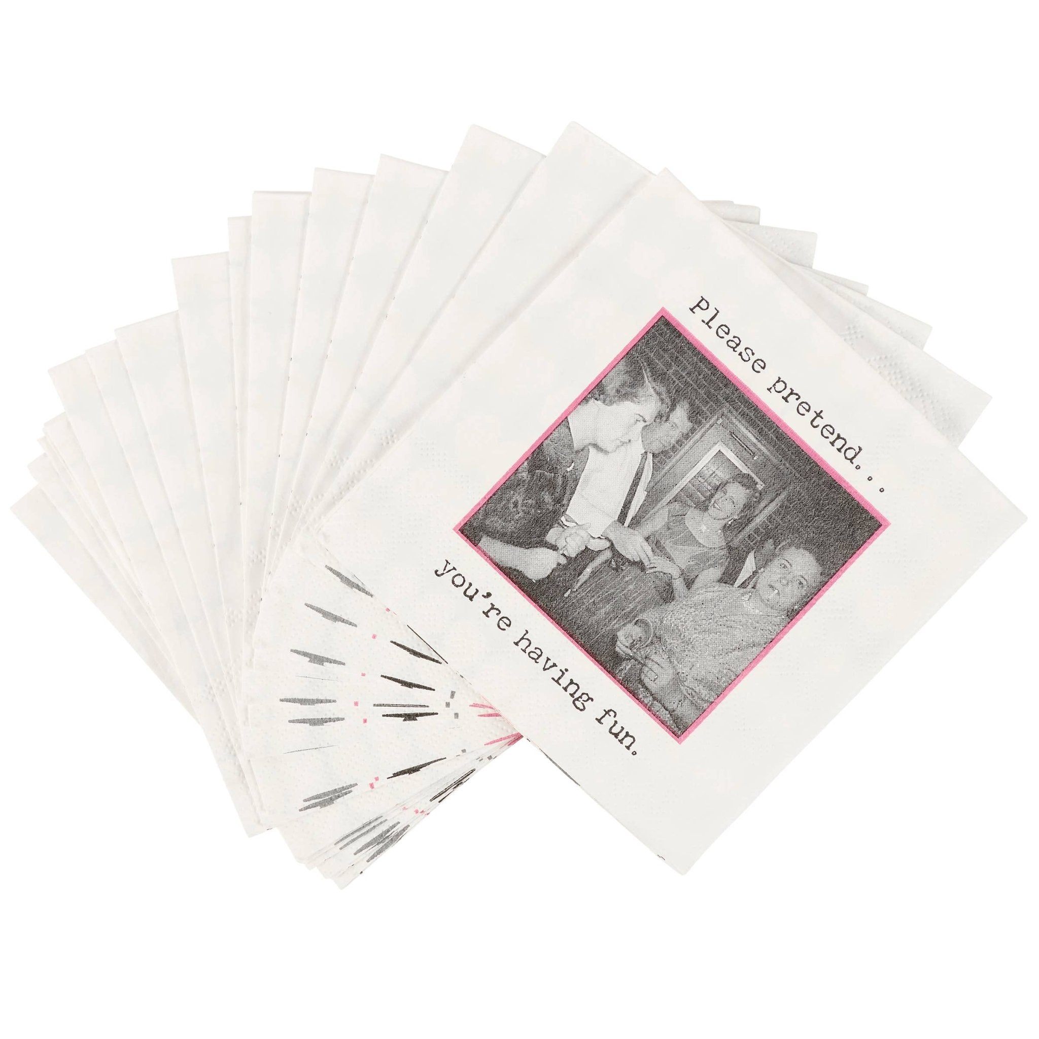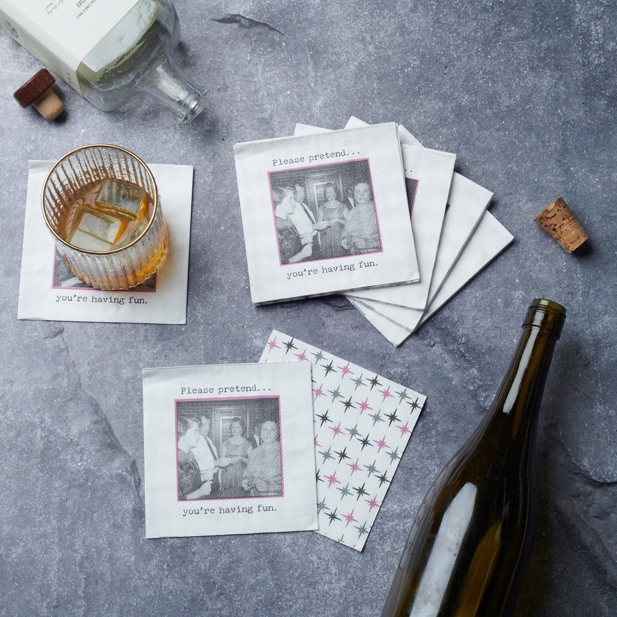 Perfect for entertaining guests and making clean-up a breeze, this disposable beverage napkin from our Trash Talk By Annie Collection displays a vintage black and white photograph complemented with a humorous sentiment that reads "Please Pretend You're Having Fun." Beverage napkin also features a coordinating retro pattern on the back when flipped as well as the rest of the napkin when unfolded. Our Pretend You're Having Fun beverage napkin measures 5" by 5" and comes shrink-wrapped in a set of 20 napkins. A fun retro bar accessory perfect for everyday use.