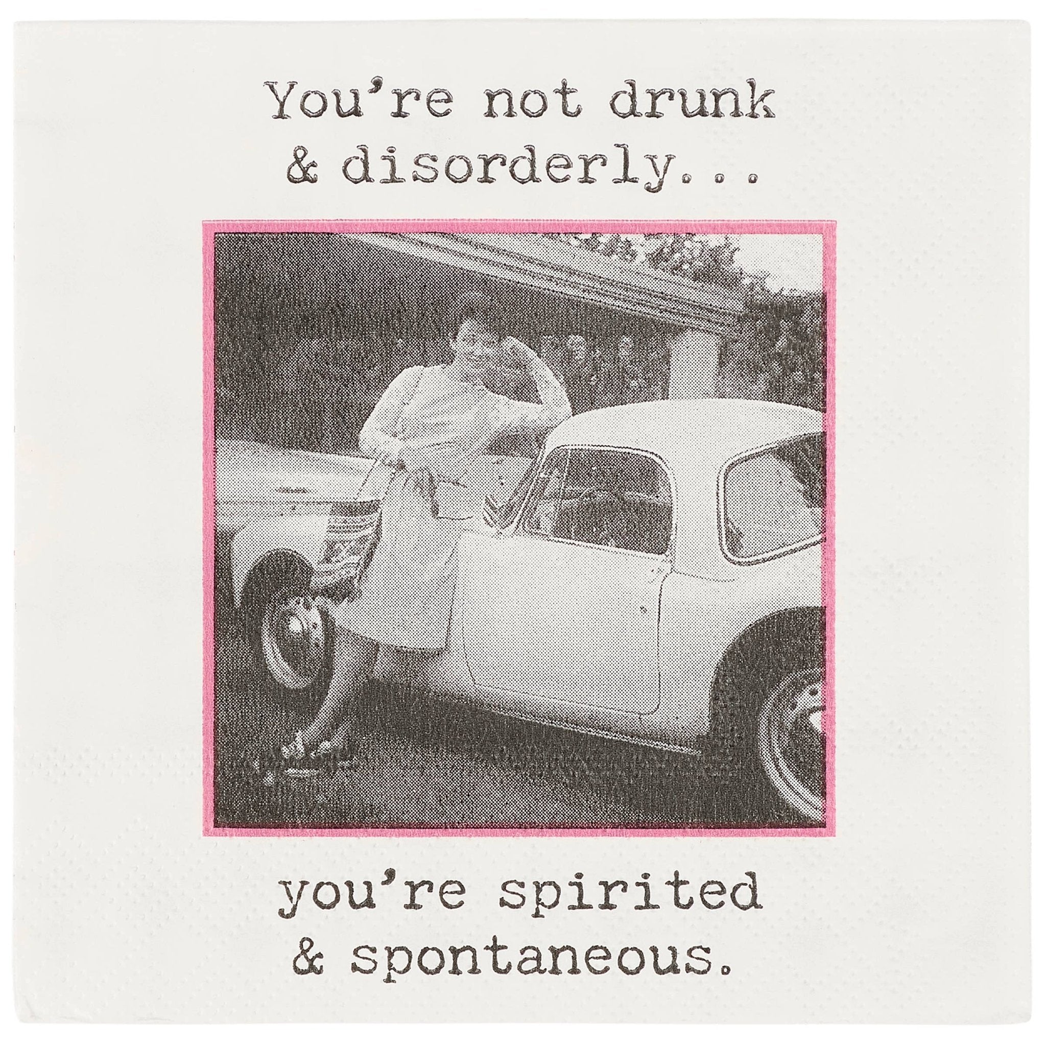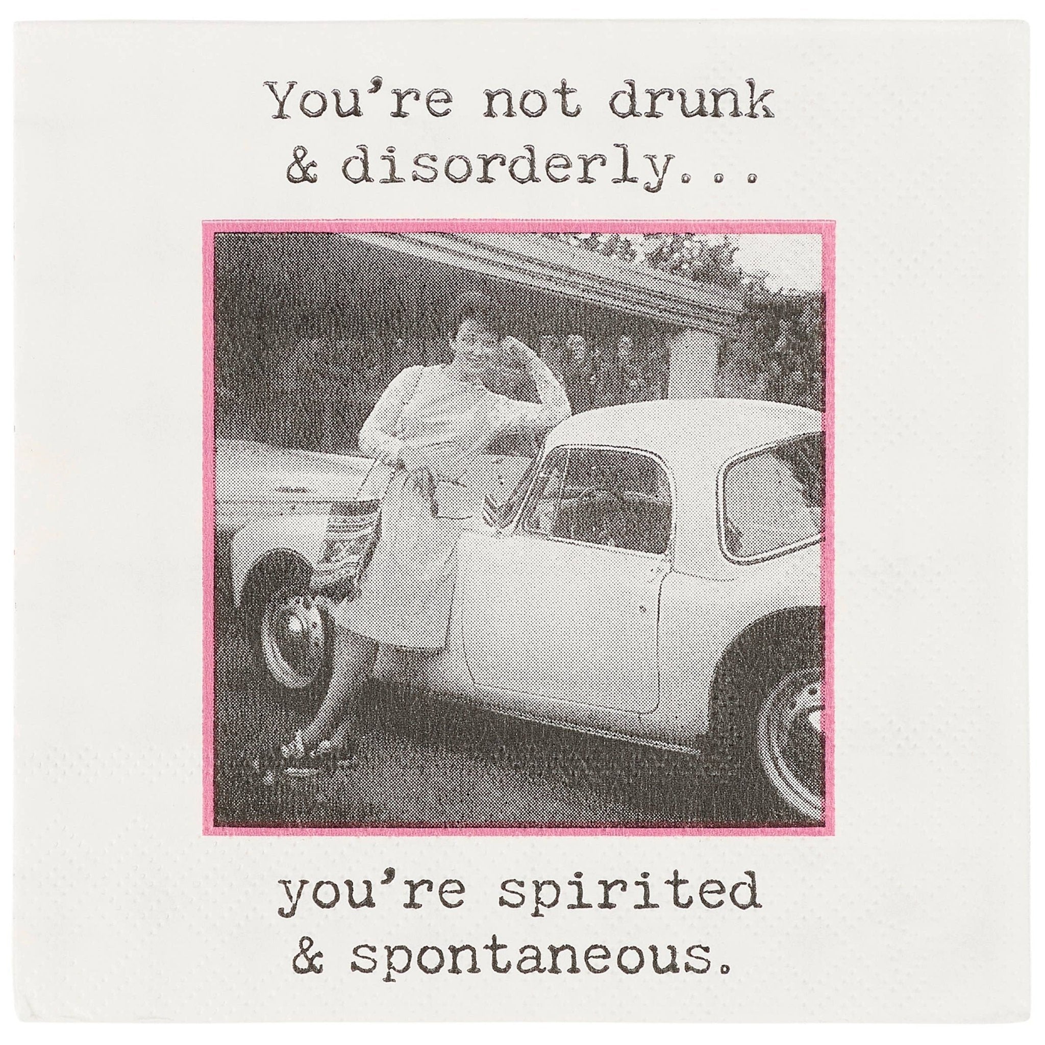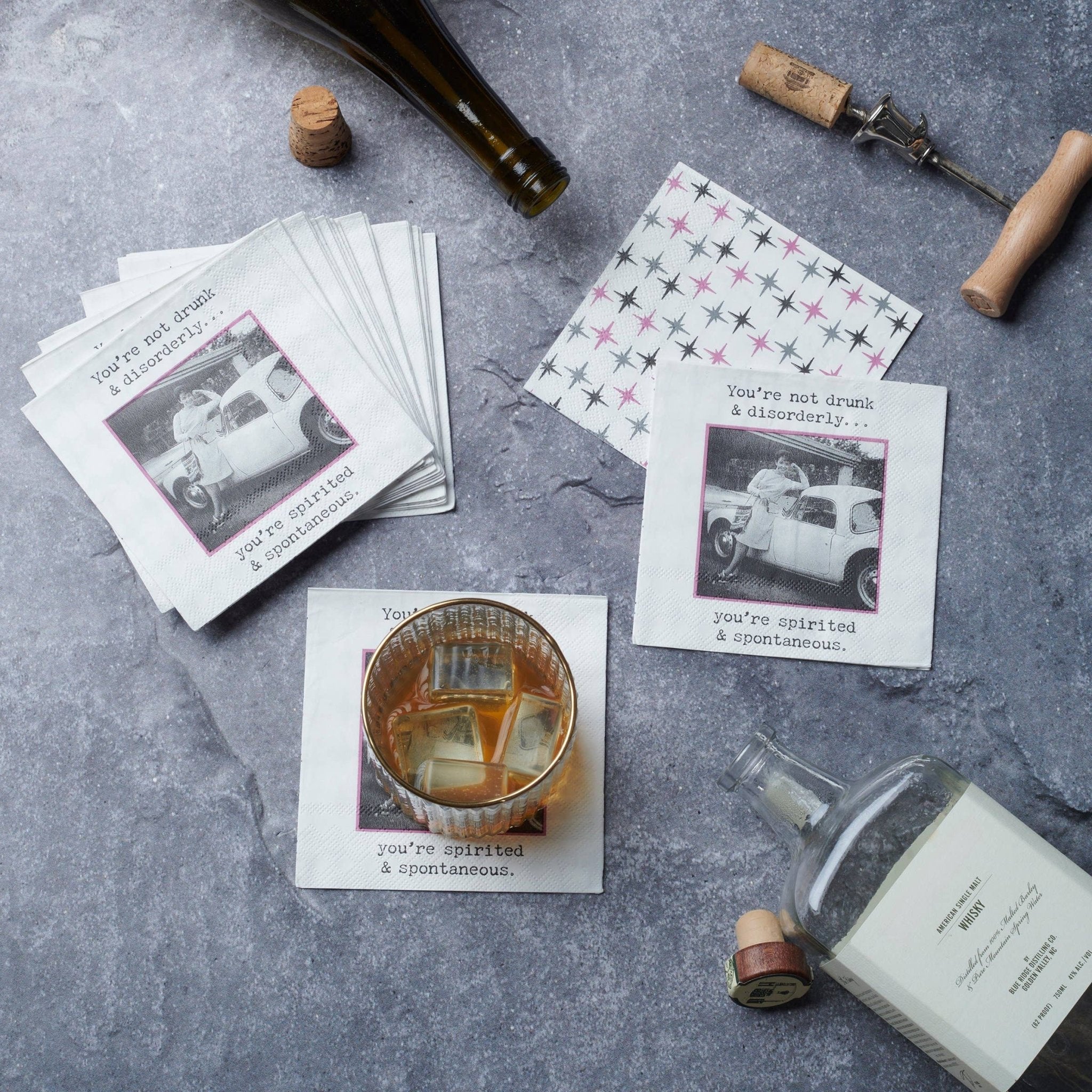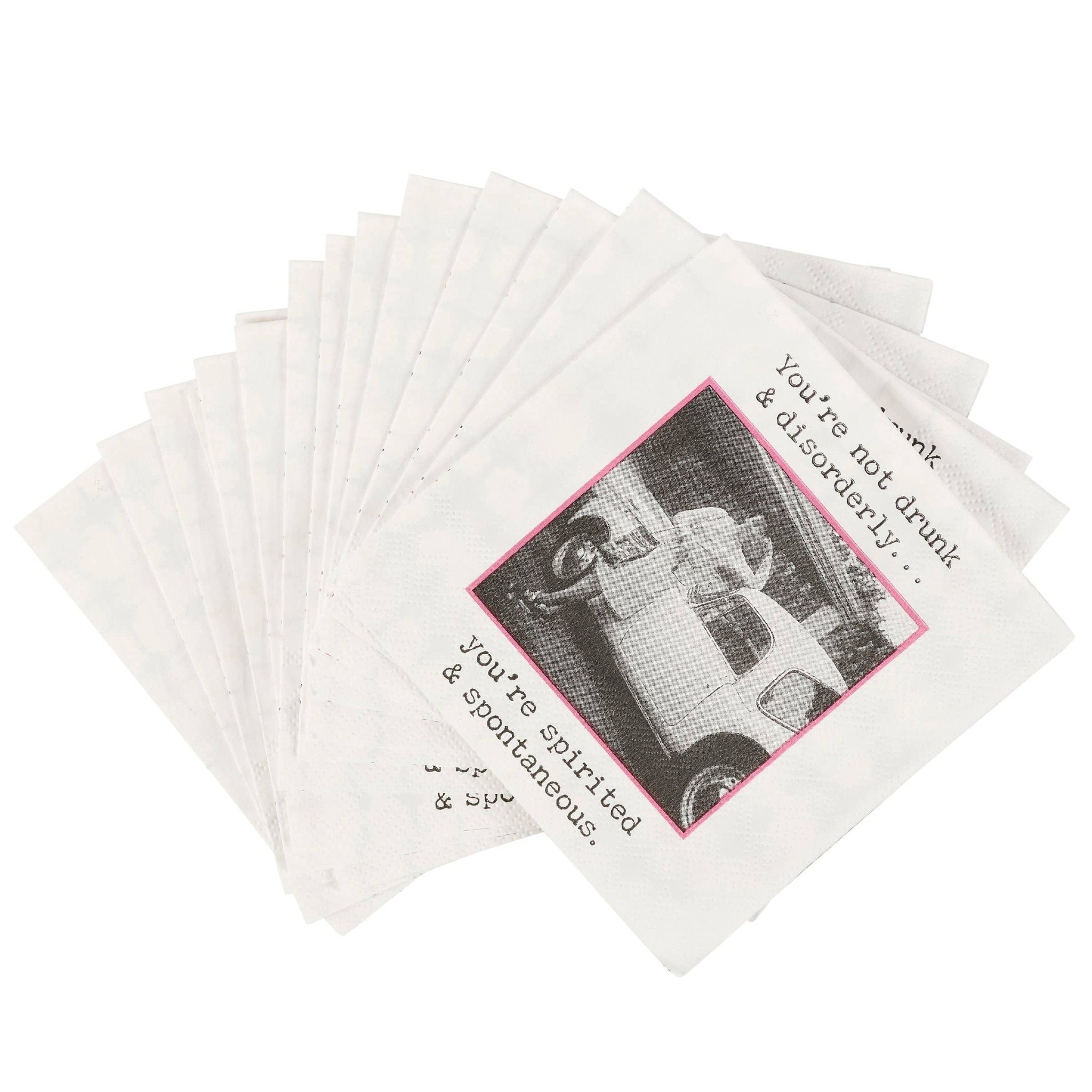 Perfect for entertaining guests and making clean-up a breeze, this disposable beverage napkin from our Trash Talk By Annie Collection displays a vintage black and white photograph complemented with a humorous sentiment that reads "You're Not Drunk & Disorderly... You're Spirited & Spontaneous." Beverage napkin also features a coordinating retro pattern on the back when flipped as well as the rest of the napkin when unfolded. Our Spirited And Spontaneous beverage napkin measures 5" by 5" and comes shrink-wrapped in a set of 20 napkins. A fun retro bar accessory perfect for everyday use.