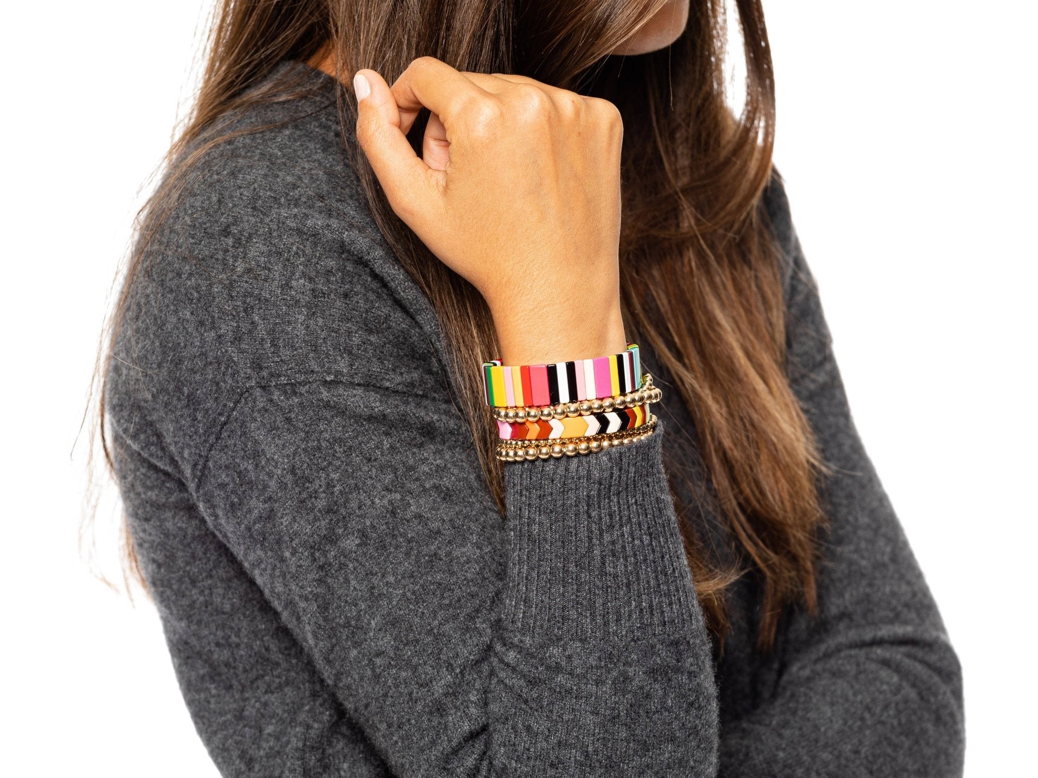 FOLLOW ME 1 - Tall vertical colored tile Bracelet. FOLLOW ME 2 - Colorful Arrow Tile Bracelet DAILY CANDY GOLD - Set of 4 Gold Plated Beaded Bracelets (2 Small / 2 Large) Bracelets sold separately. Min order of 2 per style.
