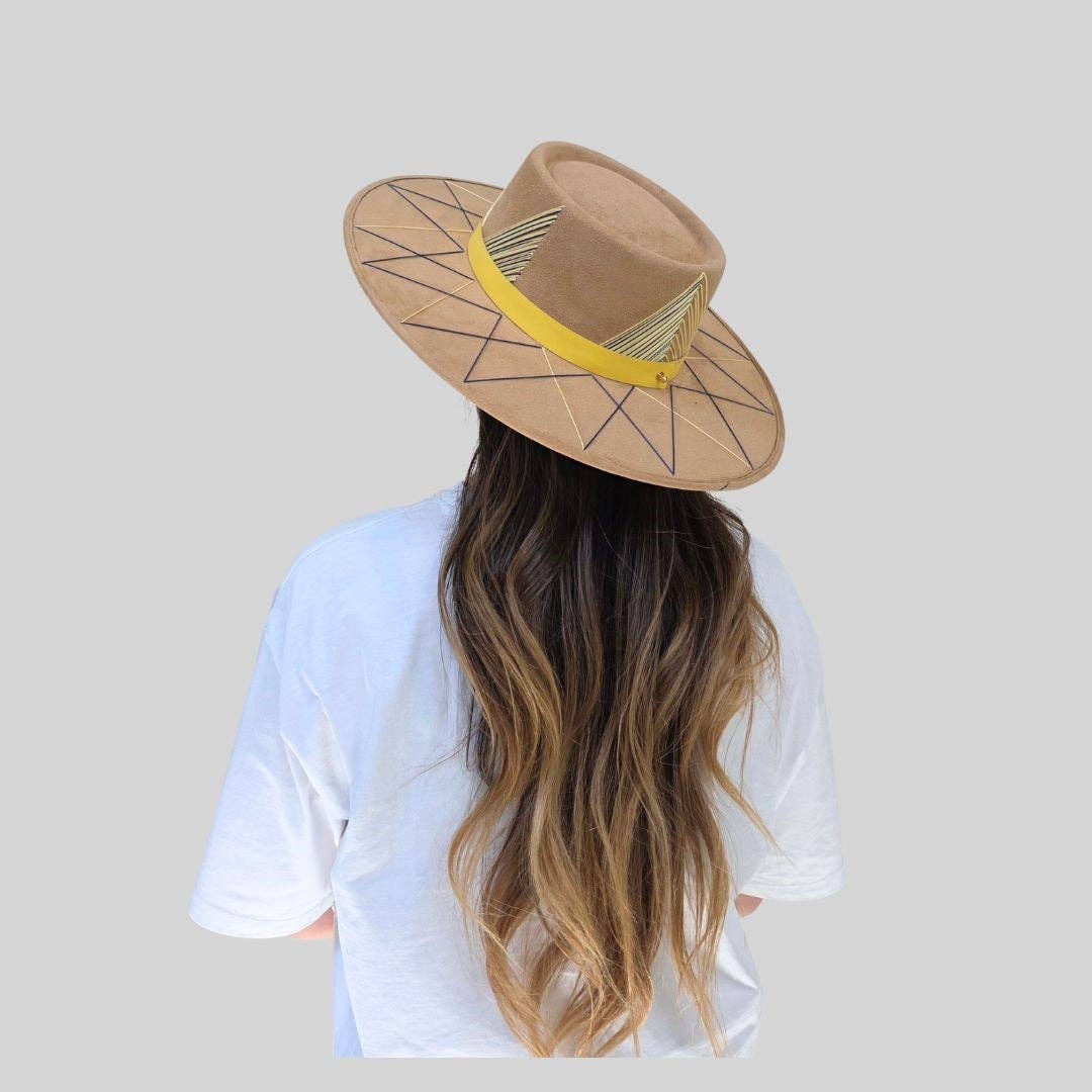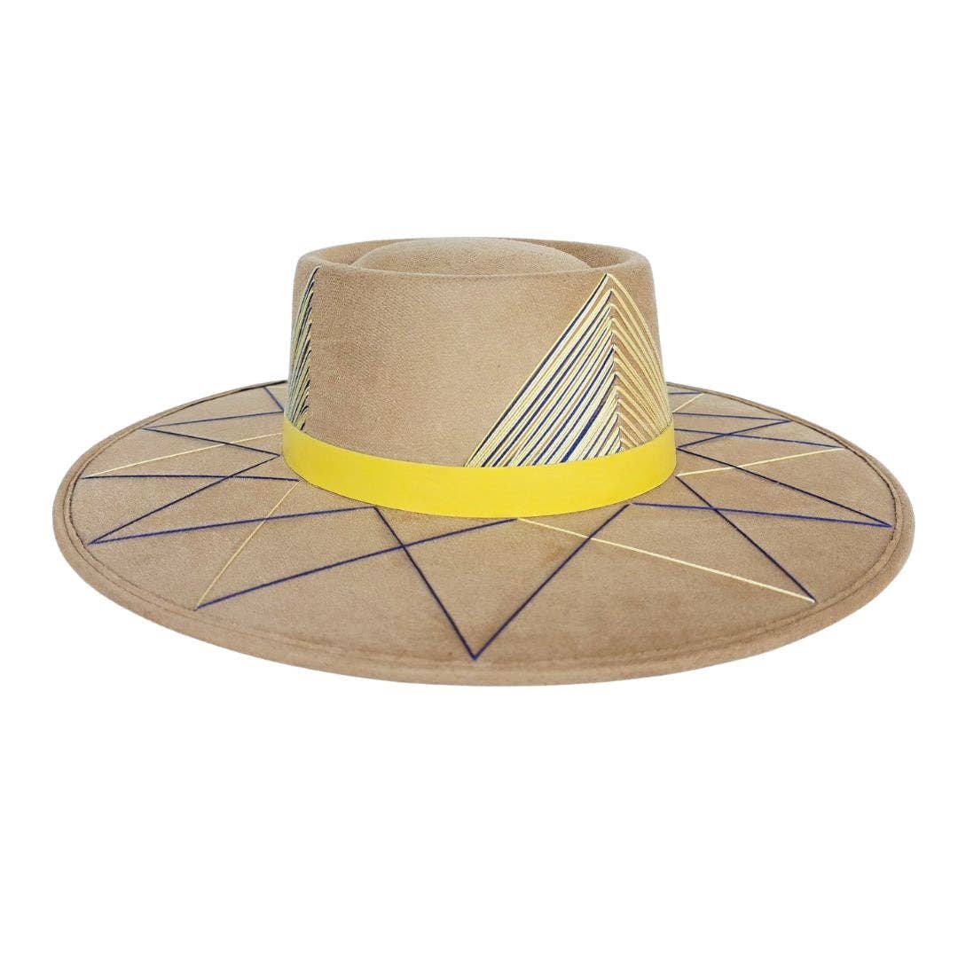 The Hallie is the hat that refuses to blend in. A warm camel polyester suede base gets a serious upgrade with a yellow leather band and vibrant blue and yellow embroidery wrapping the crown and brim — bold, artisan, and completely one-of-a-kind energy. The telescope crown silhouette adds architectural drama, while the structured fit keeps everything sharp from every angle.