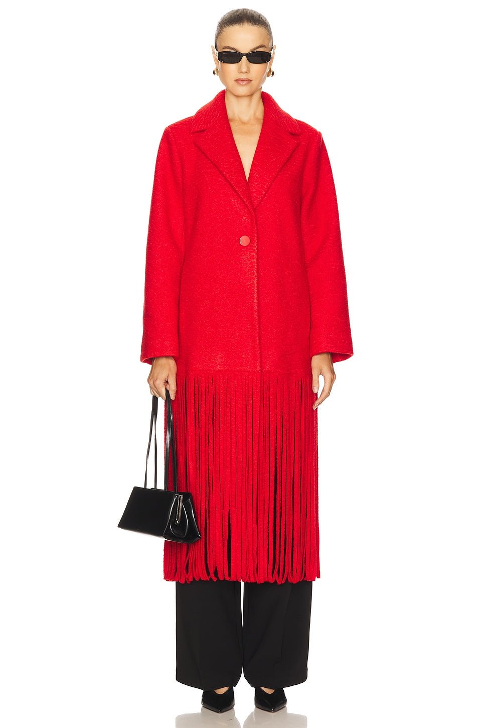 Knit trench coat with fringe details. One button and functional pockets. Pronounced twill lining. Model is5'10" and wearing a size S.
