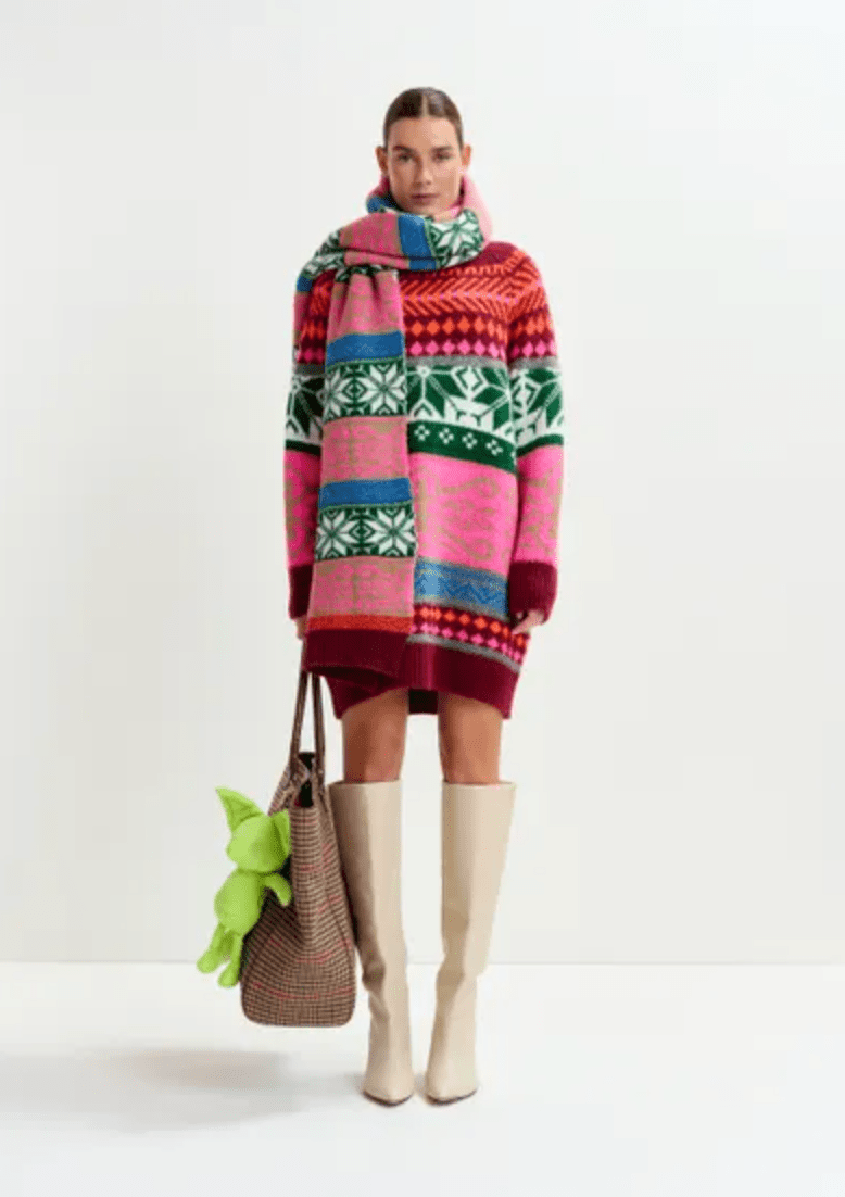 Wrap yourself in color and comfort with this jacquard knit scarf, featuring a bold multicolor pattern and intricate detailing throughout. Measuring 230 x 38.5 cm, it offers generous coverage for chilly days without feeling bulky. Ribbed trims at the ends add a refined touch, making it the perfect finishing piece.